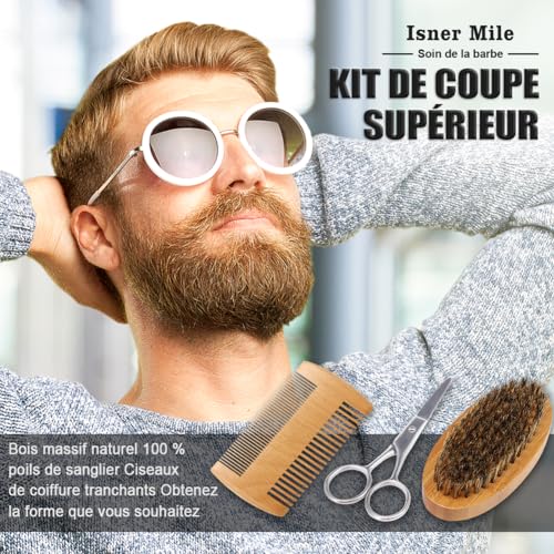 📦 Kit 9-en-1 inclus : Shampooing barbe, huile barbe (40 ml), baume, brosse, peigne en bois, ciseaux, sac de voyage et guide barbe